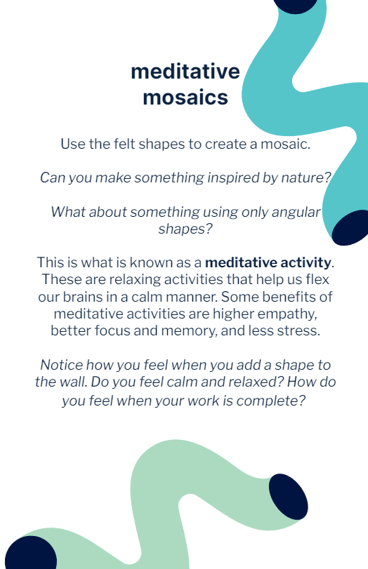 Meditative Mosaics are felt pieces designed in Procreate & Adobe Illustrator and laser cut using a Glowforge. The point of Meditative Mosaics is to provide a sensory experience for children who may feel stressed or overwhelmed in their current environment.